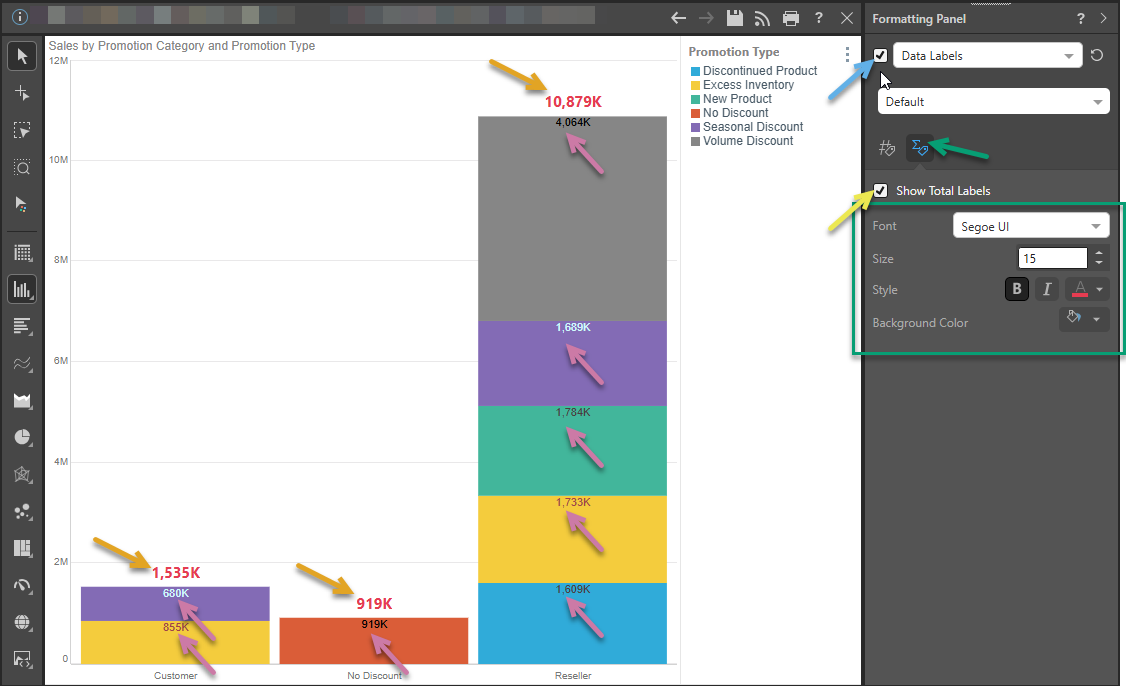 - On the Total Labels tab (green arrow), select the Show Total Labels checkbox (yellow arrow) to show a single total label for each column or bar on your stacked chart.