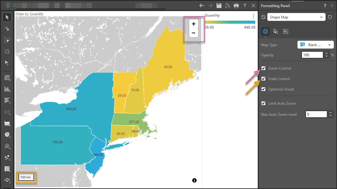 When working with Maps, a scale is shown at the bottom left corner of the visual (purple highlight below). The scale represents the ratio between the distance on the map and the corresponding distance on the ground. The scale is dynamically updated as you zoom in and out of the map. This scale can be shown or hidden as needed.