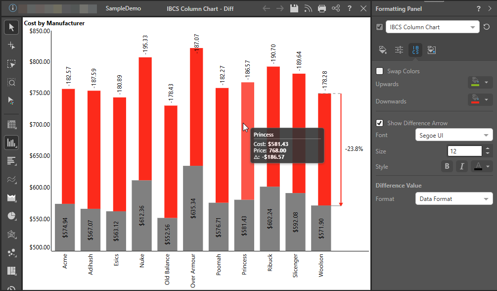 IBCS-like area charts in Pyramid compare two measures and show only upward and downward differences between their values. You can change the color corresponding to each in the Formatting panel. Values are displayed on the chart, with the final difference on the right-hand side. Additionally, you can hover over sections of the chart to display specific values at that point, and the value of the difference.