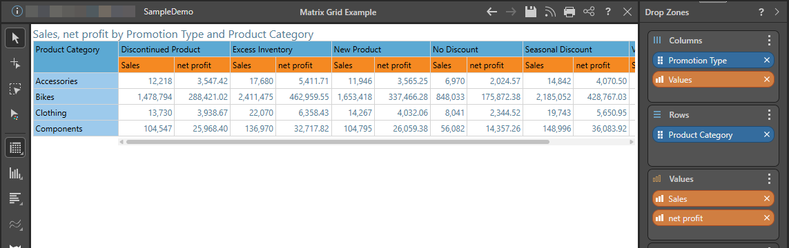 To build a matrix grid, place the required member hierarchies in the Columns or Rows drop zones. The member elements of the given hierarchies will be displayed as the column and row headers. Add the required measures to the Values zone, and then place the Values chip either in Columns or Rows drop zone.