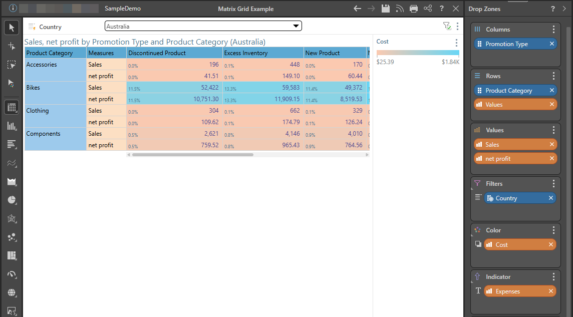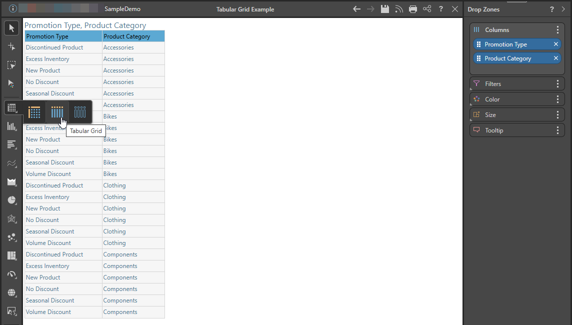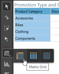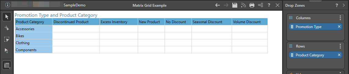 In the preceding example, the Promotion Type hierarchy is added to the Columns drop zone and Promotion Type to Rows. Each member element within the Promotion Type hierarchy is displayed as a column in the grid, while each element under Product Category is displayed as a row.