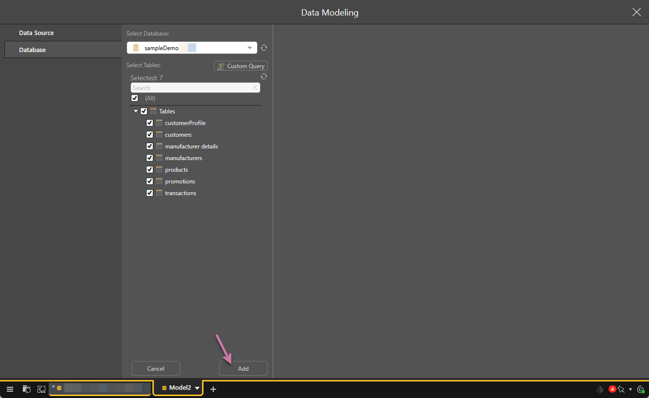To confirm your table selection and create the data model, click Add (purple arrow below).