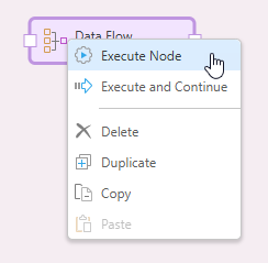 - Select a single node and right-click Execute and Continue to execute the selected node and then each of the nodes that follow it in the Master Flow.