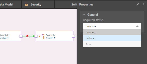 To edit a connection, click on it to open its Properties panel. The required status is set to 'Success' by default, but it can be changed to 'Failure' or 'Any'.