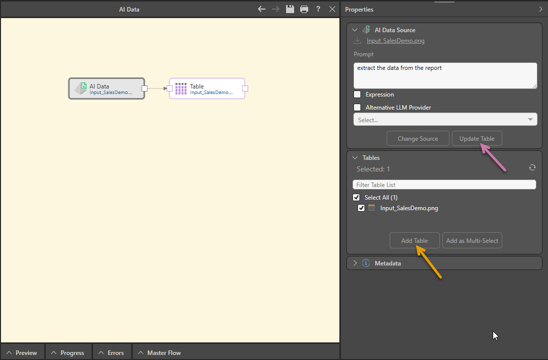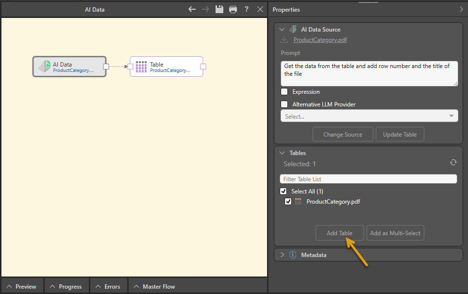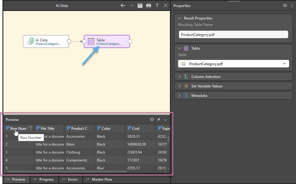 Important: There is always a one-to-one mapping between the AI Data node and a single Table node. If you want to extract data from two different files, you need to create two AI Data nodes and Tables, and use a Join to connect the table nodes to each other.