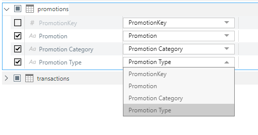 As an example, the PromotionKey is an integer (as indicated by the # icon) and is sorted by itself, so its values will be sorted in ascending numeric order.