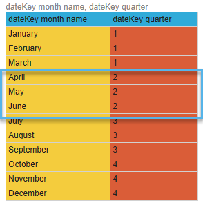 It is worth considering the impact of an inappropriate sort order on calculated measures. The following grid shows the two columns that are in use, the Month Name and the Quarter columns: