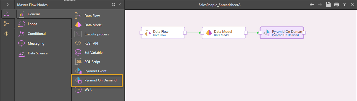 - Connect the Pyramid On Demand node to the Master Flow anywhere after the Data Model node.