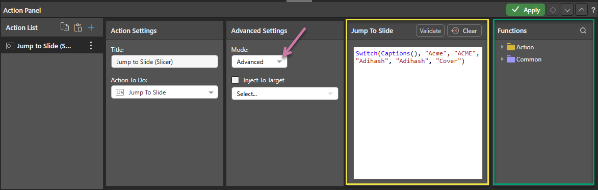 - Create a PQL expression that maps the values from your slicers to your Slides (see below for more information). Note: You should use this advanced feature if you want to use the PQL functions to create a switching or conditional effect, or otherwise apply additional logic to your action.