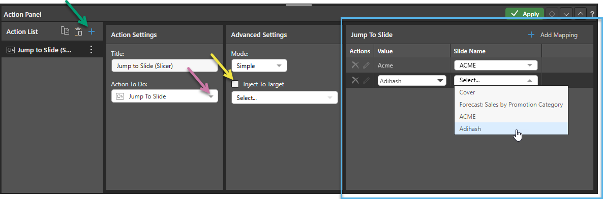 If you are creating a Simple action, the options to open a particular slide using a slice action are presented in the Jump to Tab panel. You need to click Add Mapping, then pair a slicer value with the slide that should open when that value is chosen. This mapping uses the Slide Name as defined in your Slides panel.
