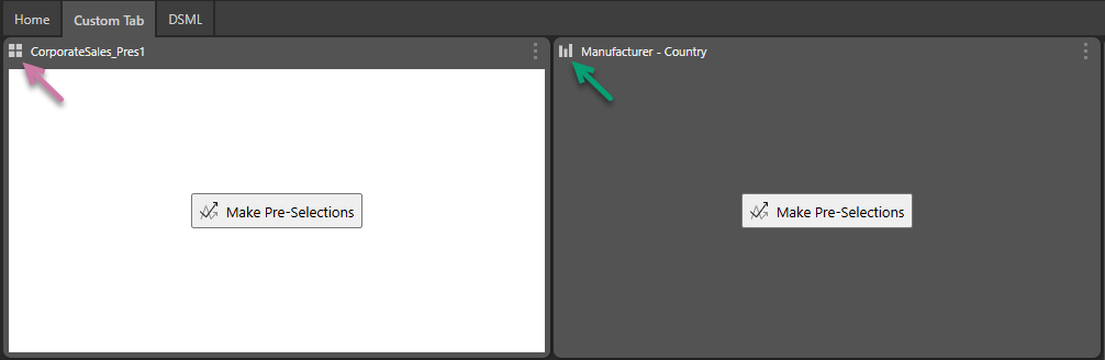 The Make Pre-Selections option, shown at the center of the panel, indicates that the presentation (purple arrow above) and discovery (green arrow) both incorporate Pre-Query slicers. You need to click Make Pre-Selections to open the Pre-query slicer dialog where you can select slices or bookmarks and run the query.