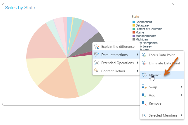 - Drag your cursor across the data points or members that you want to select and right-click Data Interactions > Interact (brown arrow):