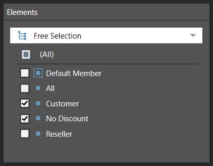 Choose the hierarchy elements that will be included in the slicer. There are three ways to determine the slicer's elements:
