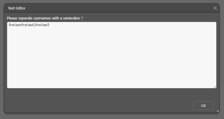 Alternatively, click the expand icon (blue arrow above) to open the Text Editor and type the usernames as a semi-colon separated list: