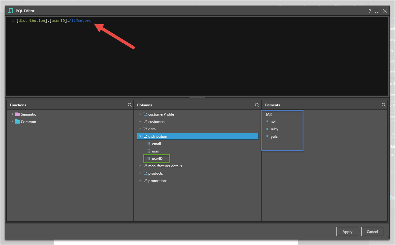 - If the slicer in the publication is from an SQL data source, create a PQL expression using Semantic or Common functions that will determine the recipients for this schedule.