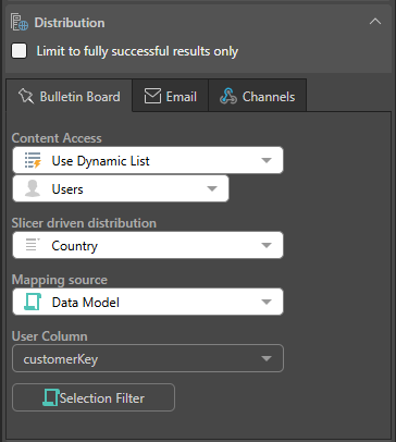From Model, users can mark given tables or columns as distribution tables or columns. These tables and columns are hidden from the data model and cannot be used to build queries. However, they are exposed in the PQL Editor when configuring data mapping for dynamic distribution, and can therefore be used to create the dynamic distribution list.