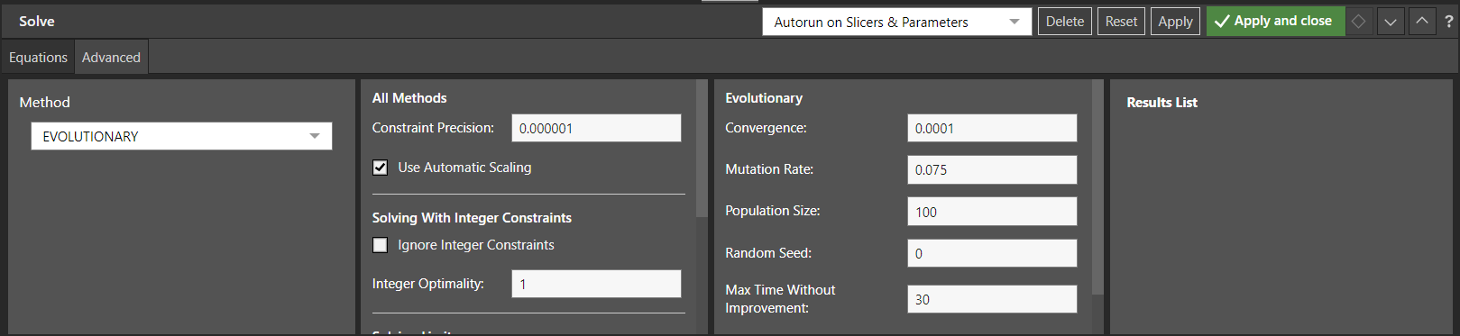 Running Solve applies your selections. Details of the optimization process are shown in the Results List and the actual results of the optimization are displayed in the Tabulate spreadsheet.