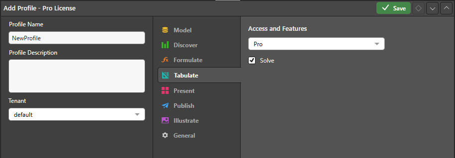 Administrators manage access to Tabulate through the Admin Console using a combination of Profiles and User Types. Profiles control the different authoring workflows and apps that Pro, Analyst, and Viewer users can access. Different profiles are defined and then applied at either the role level or user level.