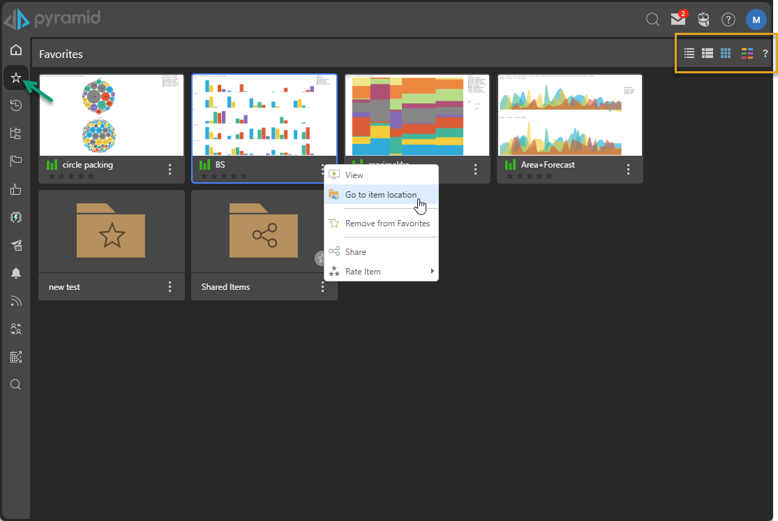 To open an item from the Favorites list, click its thumbnail in this view. Alternatively, right-click or open the item's context menu, and select View to open the content item or folder.