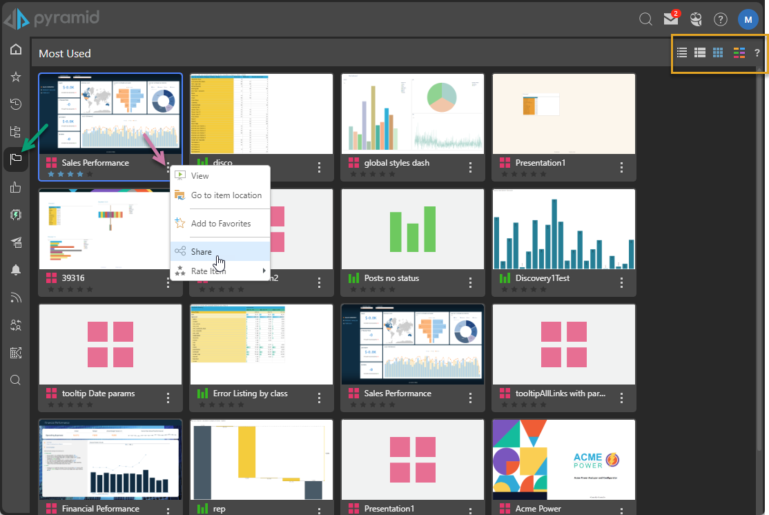 The Most Used view is indicated throughout the system using a Flag icon. For both the Pro and Analyst versions of the CMS, this icon is hidden by default. You need to click the ellipsis menu to show the submenu.