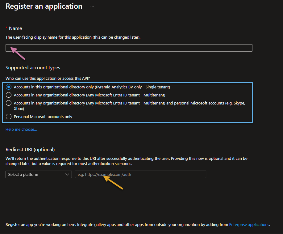 Important: The following steps show an example setup and configuration process. It walks you through the basic process and helps you to understand where to source the information you will require when setting up the Pyramid connection. For more information about this process, please see the Microsoft Azure documentation.