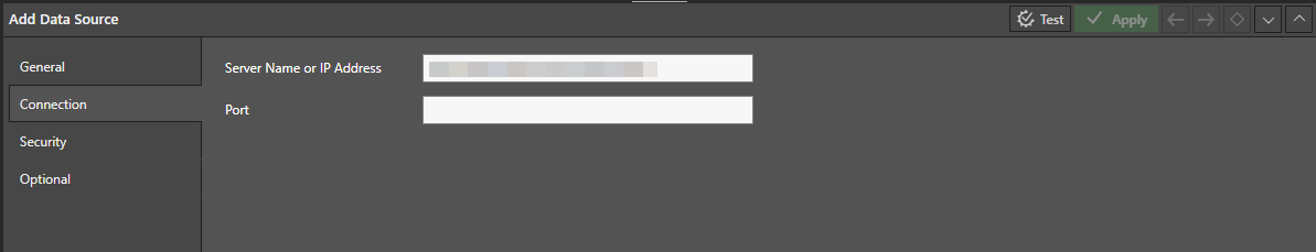 On the Connection tab, specify the connection string for your data warehouse as the Server Name or IP Address. (This was the SQL connection string that you copied when creating your Warehouse settings.)