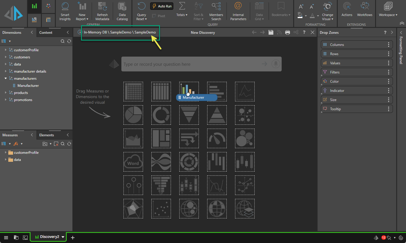 A new, empty, discovery is created in the selected Model and is opened in the Discover app. Note the Model location in your discovery's status bar (green highlight below):