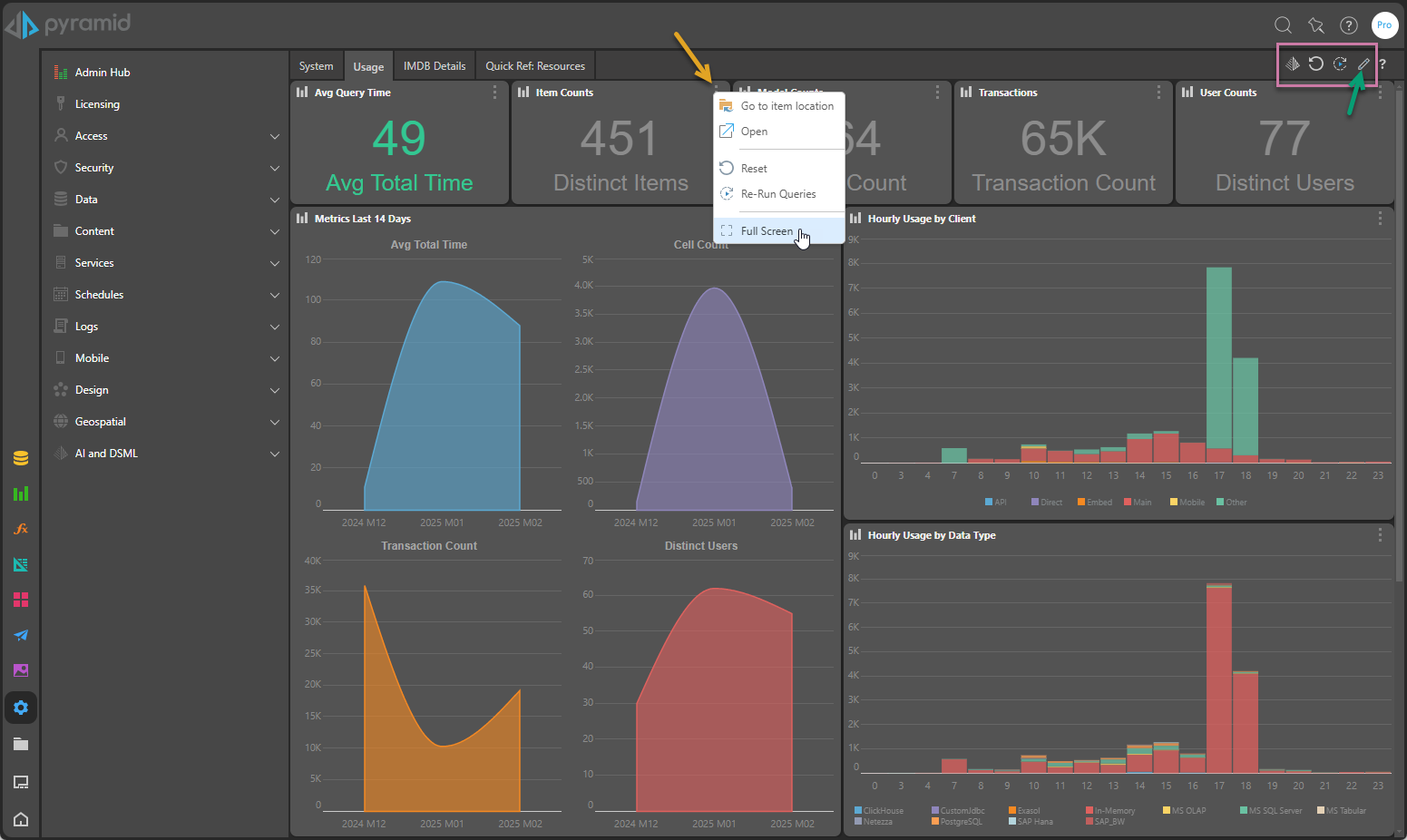 You can customize your own view of the Admin Hub as needed; your edits will not be visible to other users. The widgets used to edit the contents are at the top-right of the page (purple highlight above):