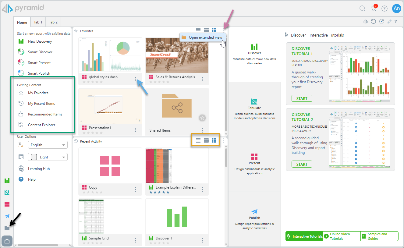 Your User Hub may include one or more containers that include Content Views, for example, Favorites and Recent Activity containers. You can show the content items in these containers as tiles, details, or content views (orange box above), jump from the container to the Content Manager using Open Extended View (purple arrow), and interact with the content items themselves using their context menus (blue arrow).