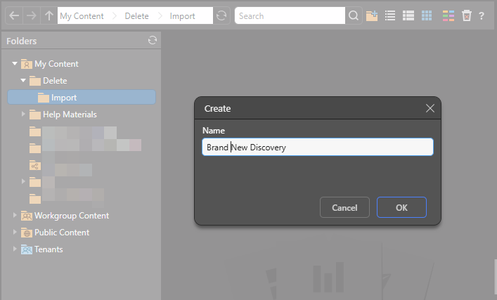 If you have write access to a folder in Content Explorer, and your license entitles you to create a content item of a given type, you can create a New Item by right-clicking some empty space and choosing New Item > New <Item Type> from the context menu. Once this option is selected, you will be prompted to provide a name for your new item before you can begin the standard creation process. The New Item Type is created in the current folder.