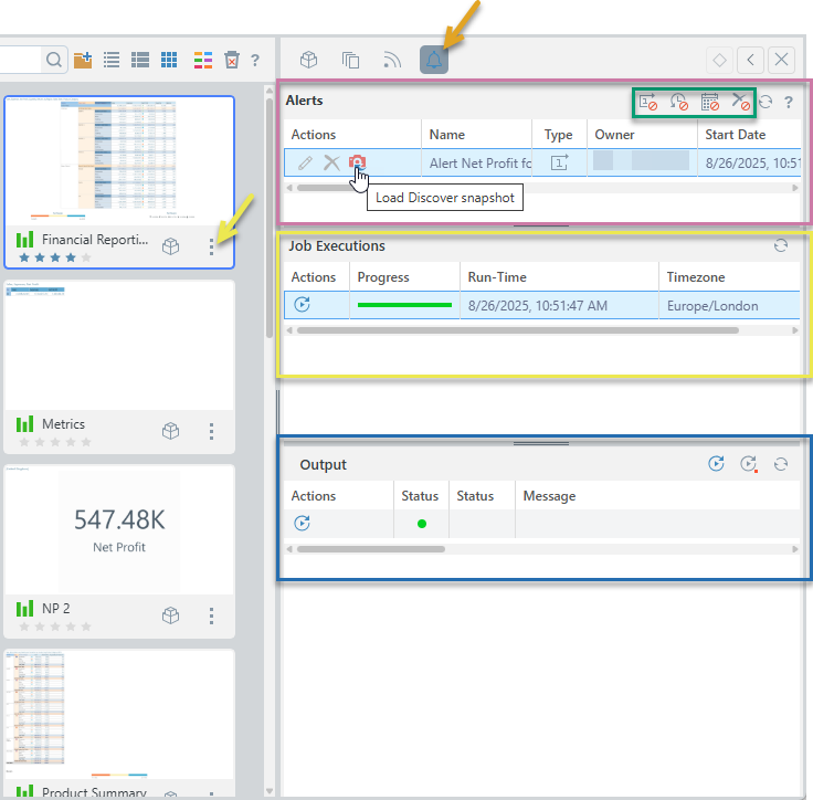 Users can create and edit Alerts for both Discover reports and Present dashboards. Alerts for both content items are scheduled events that check if certain data driven conditions are met. If they are, they send the specified users an alert to tell them the outcome of the data driven check.