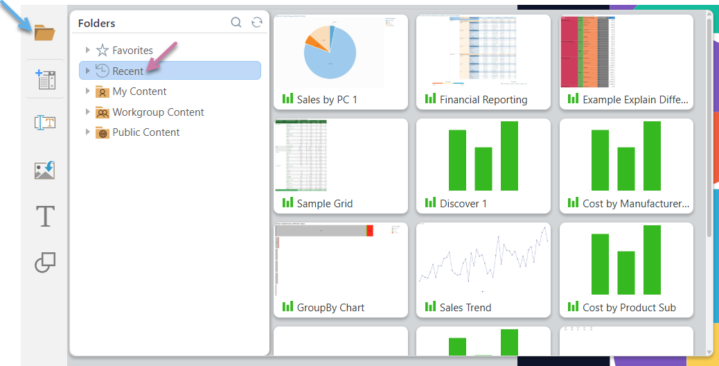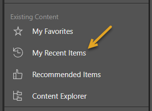 "Recents" is a FLAT list of all recently used content items by the current user - providing a convenient mechanism for users to quickly find the latest items they used. Recent content can be accessed from the User Hub as well as many other locations through the application where content is accessed.