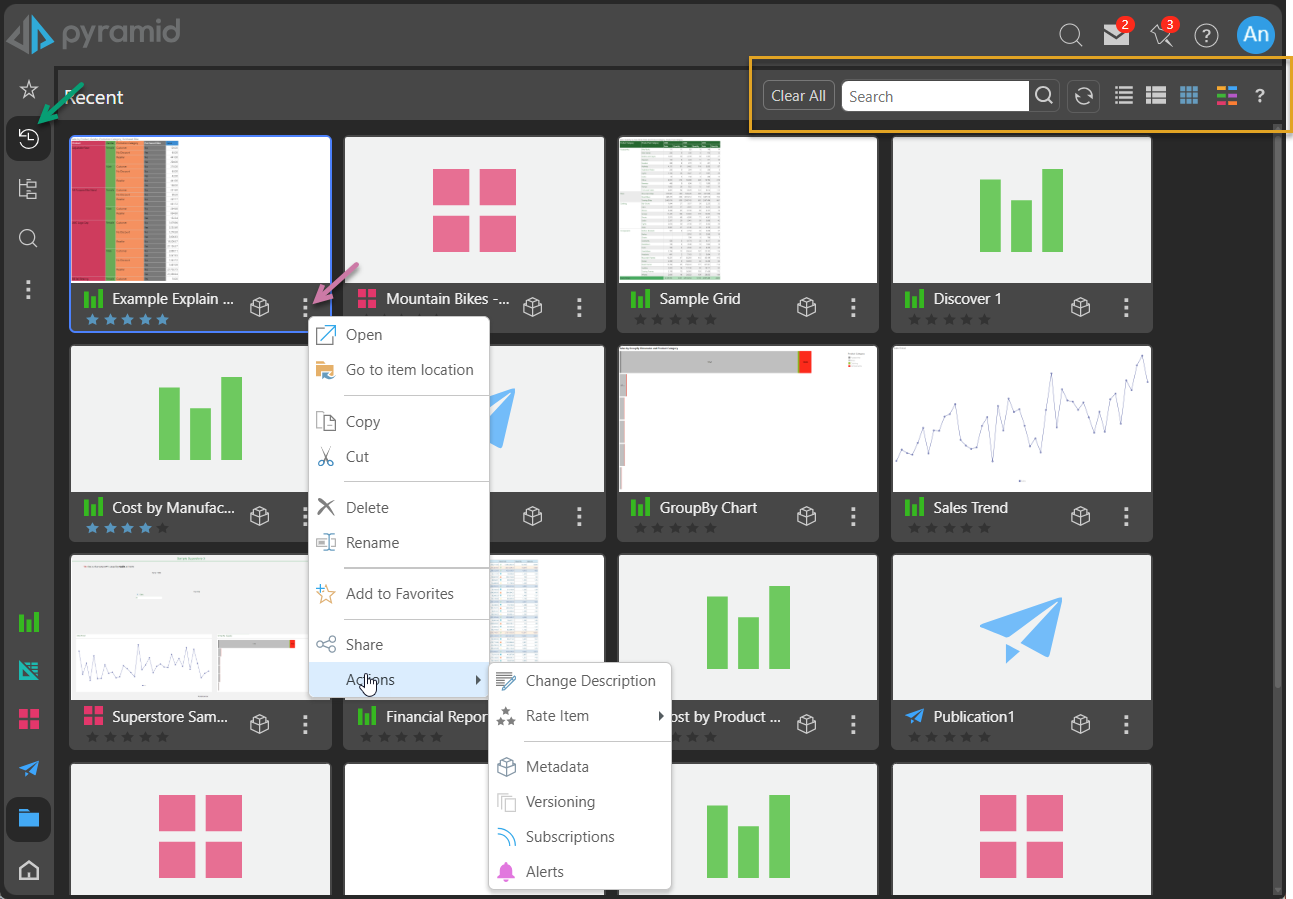 Items in the Recents view behave just like those in any standard Content Manager view, with functionality tailored to the specific use case within the app.