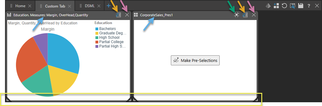 - Add Content or Widget: Add a discovery, presentation, or widget preset to your tab (yellow arrow above). For more information, see Add content or widget.