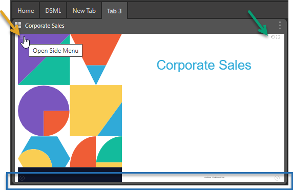 - Presentation Menu: Open the presentation runtime menu from the Hamburger (orange arrow above) to re-run queries, and set slicers and bookmarks.