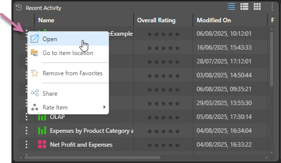 - Open: Open the item in its editor.