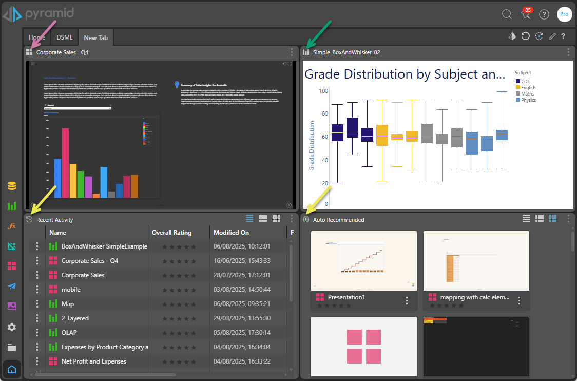 The widget presets allow you to add various home page and content manager views directly to the user hub. The Content Manager is the main toolset for working with content in the Pro and Analyst clients. It includes various views of the content system to enable users to find relevant content easily.