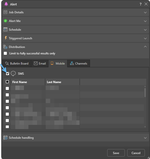 From the Mobile tab, select the SMS checkbox (blue arrow below). This will show a list of Pyramid users. Select the users that you want to distribute alerts or subscriptions to using SMS, and then Save your selection.