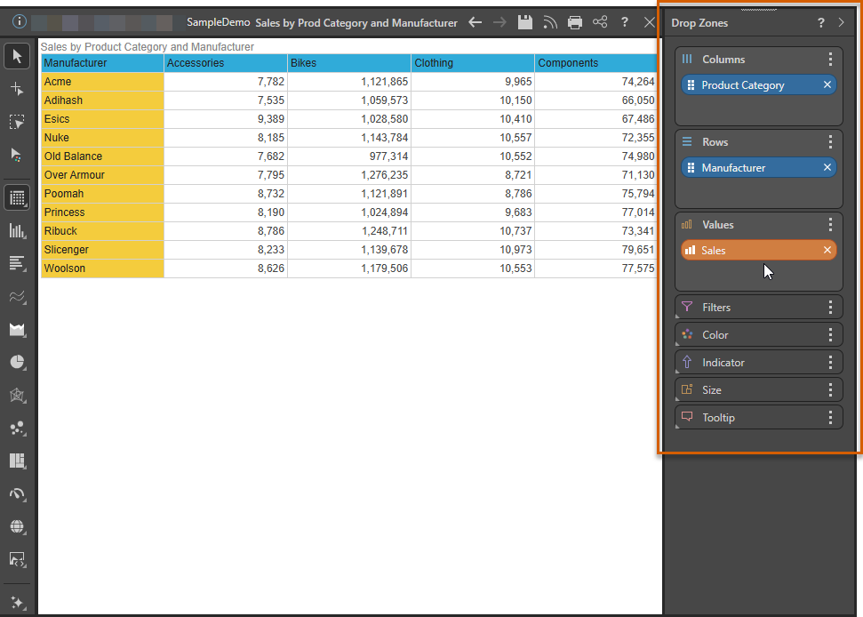 - Values: measures are placed in the Values zone, which drives the quantitative data in the query.