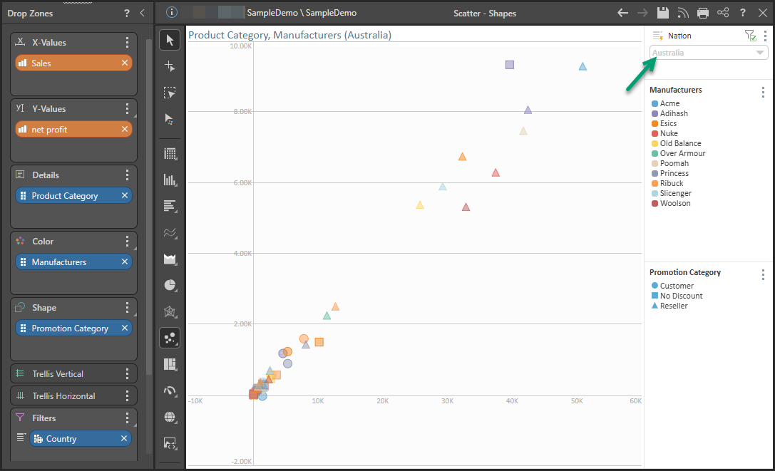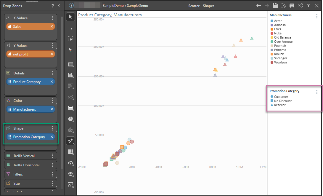 In this example, the Scatter Chart displays Sales and Net Profit for Manufacturers, with Product Category in Details: