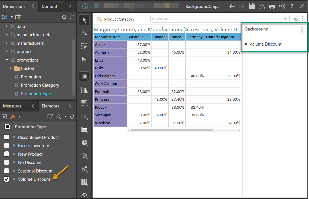 - The Volume Discount element is then added to the query from the Promotion Type hierarchy. The element is selected in the Elements panel (orange arrow below), causing it to be automatically added as a background chip (green highlight) and the entire query to be filtered by Volume Discount: