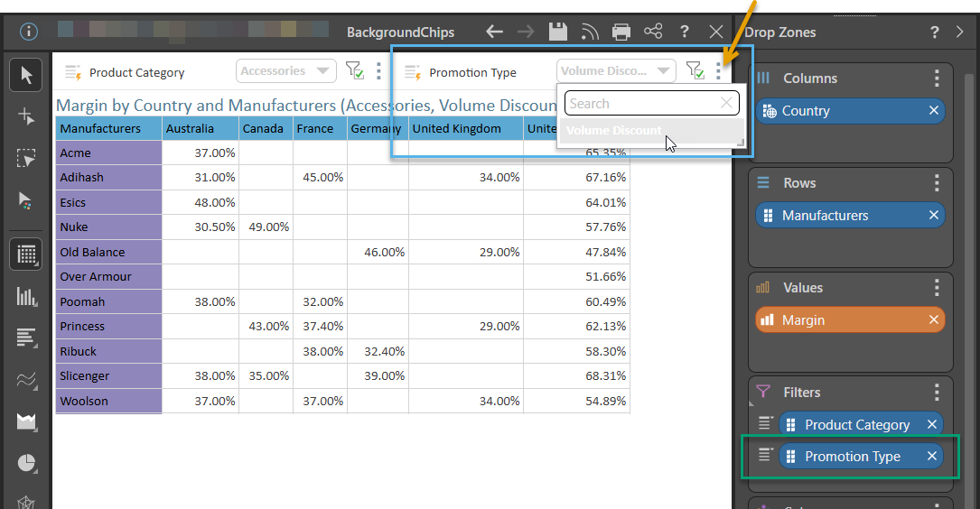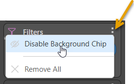 - To enable or disable this function from the Filters drop zone, open the Filters context menu and then click Disable Background Chip or Enable Background Chip.