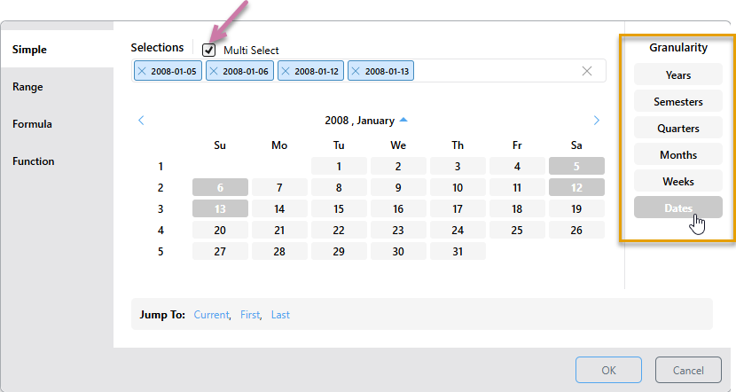 - First: Selects the first date-time period in the system according to the selected level of granularity. If the granularity is set to Dates, the first date in the system will be selected; if the granularity is set to months, the first month in the system will be selected; and so on.