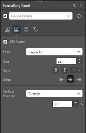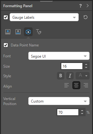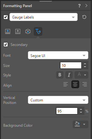 Additionally, you can click Auto Fit Labels to Enable or Disable the Auto Fit functionality that makes your label text resize automatically to fit the available space. Note that, where the Auto Fit Labels option is enabled, the sizes of your labels (entered in this panel) still affect the size of the text in the gauge; instead of them setting the exact size of the text, they allow the Auto Fit function to find a relative size for the different parts of the label. For more information, see Auto Fit Labels.