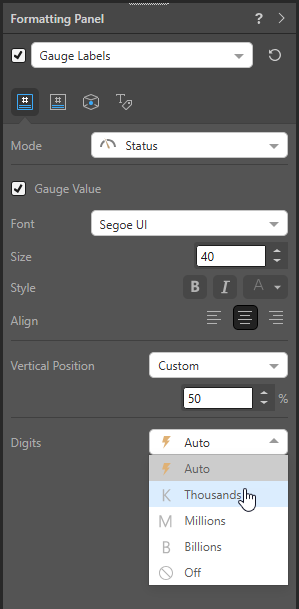 - Mode: Select which gauge value to show in the middle of the gauge - status, target, or value.
