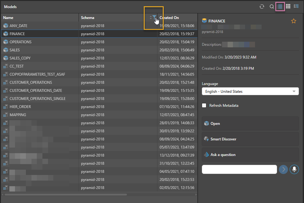 The List View (purple highlight below) displays the list of models and views, with the metadata displayed in dedicated columns: Name, Created On, Modified On, and Version. Hover over a column to show sort and filtering icons (orange highlight).