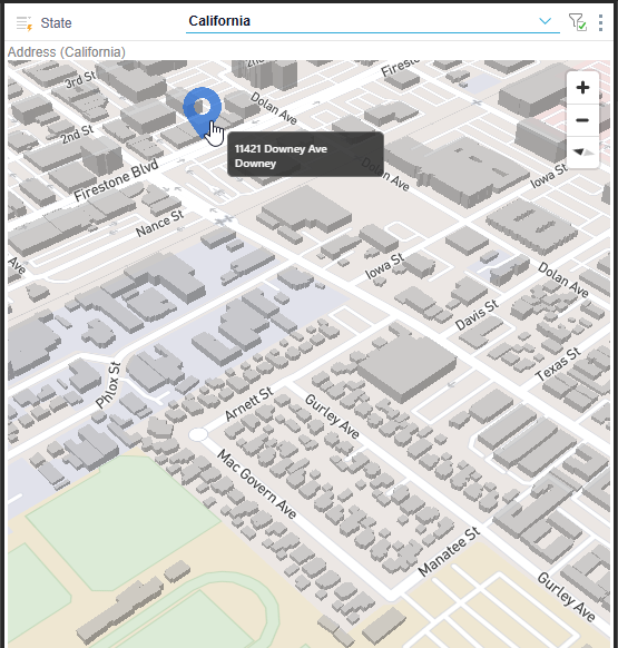 You can zoom in on your 3D Street maps using the standard zoom tools, rotate and tilt the map to get a 3D perspective, and, once you're done, reset your tilt and rotation commands to return to your map. For Layered Maps, you can also see location markers.