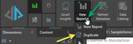 • Click New Report > Duplicate (yellow arrow) to create a duplicate copy of the currently open report and open it as a new Discover tab.