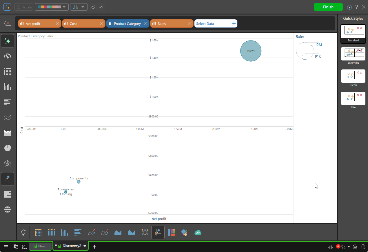 In this example, three measures (Net Profit, Cost, and Sales) were added to create a bubble chart, with Net Profit on the x-axis, Cost on the y-axis, and Sales on the z-axis (driving the size of each bubble):