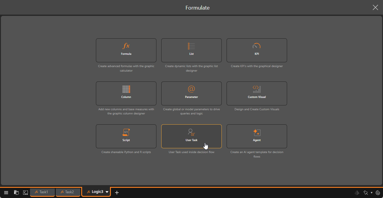 To open the User Task designer, open Formulate and select User Task from the available options: